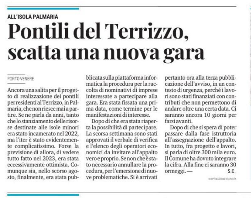 IL SECOLO XIX 19 Novembre 2025 Palmaria: Pontili del Terrizzo, scatta una nuova gara